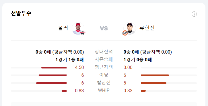 류현진은 MLB에서 쌓은 노련함을 바탕으로 타자들의 타이밍을 뺏는 능력이 탁월합니다. KIA 타선의 좌타가 많기 때문에 유리한 매치업. 반면 아담 올러는 오늘이 데뷔전으로, 적응 여부가 관건입니다.