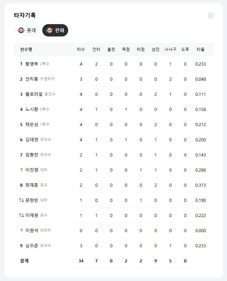 - 플로리엘-노시환은 분전했지만, 하위타선 침묵