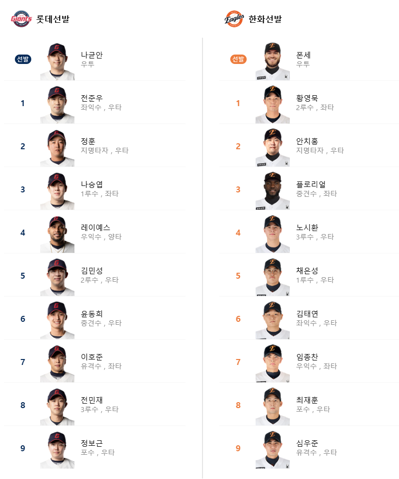 특히 오늘은 한화의 외국인 에이스 펠릭스 푼세와 롯데의 토종 에이스 나균안의 선발 맞대결이 성사되며 투수전이 예상된다.