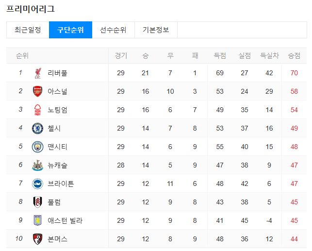 - 아스널: 리그 2위, 16승 10무 3패 (평균 득점 1.8 / 실점 0.8)