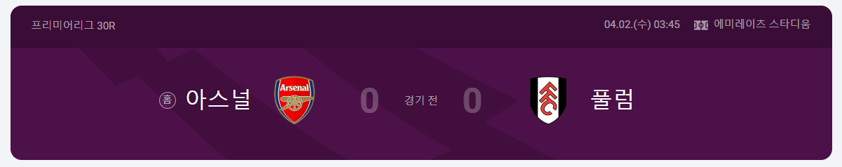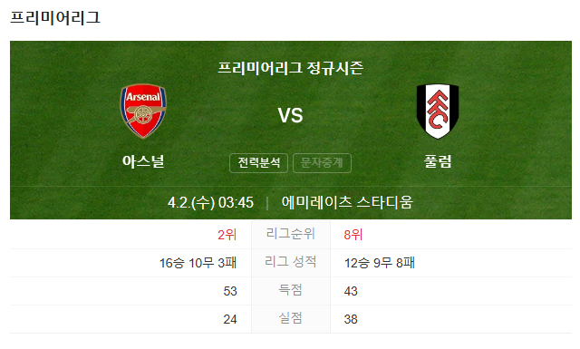 ⚔️ 대진: 아스널(2위) vs 풀럼(8위)